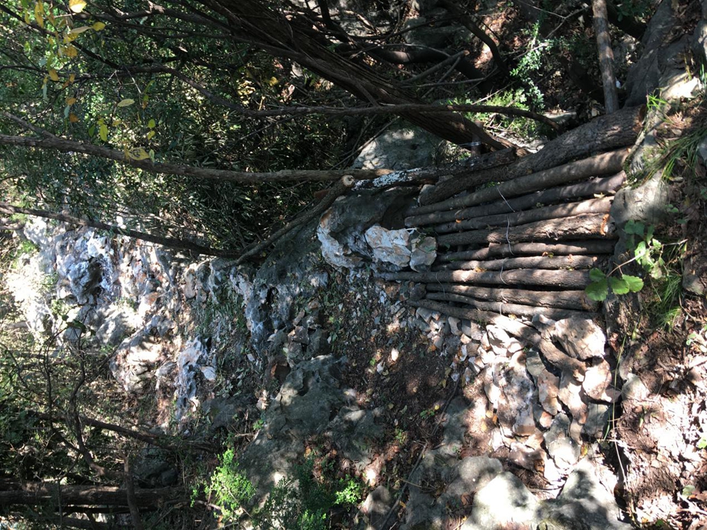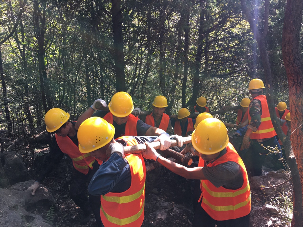 經平整的道路,鉆機器具通過挖掘機吊運至山脊處,挖掘機行無法到達的地方,還余下二里山路,通過人工搬運至鉆機坪。